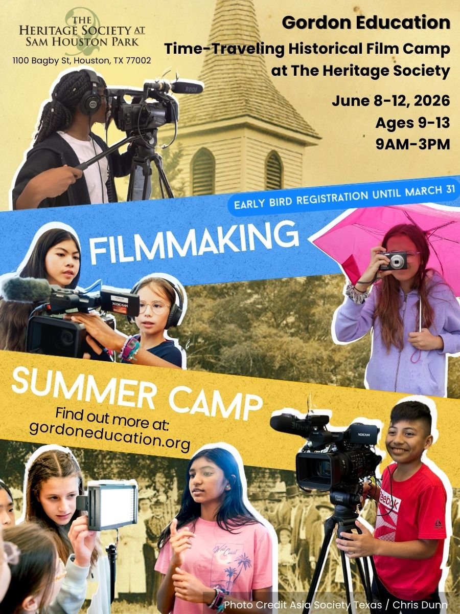 Gordon Education will host its Time‑Traveling Historical Filmmaking Camp at The Heritage Society June 8–12 for ages 9–13. The program gives campers exclusive access to the museum’s historic buildings and artifacts as they develop scripts inspired by Houston’s past. Participants work with film professionals to bring their stories to life through acting, directing, cinematography and costume design.
